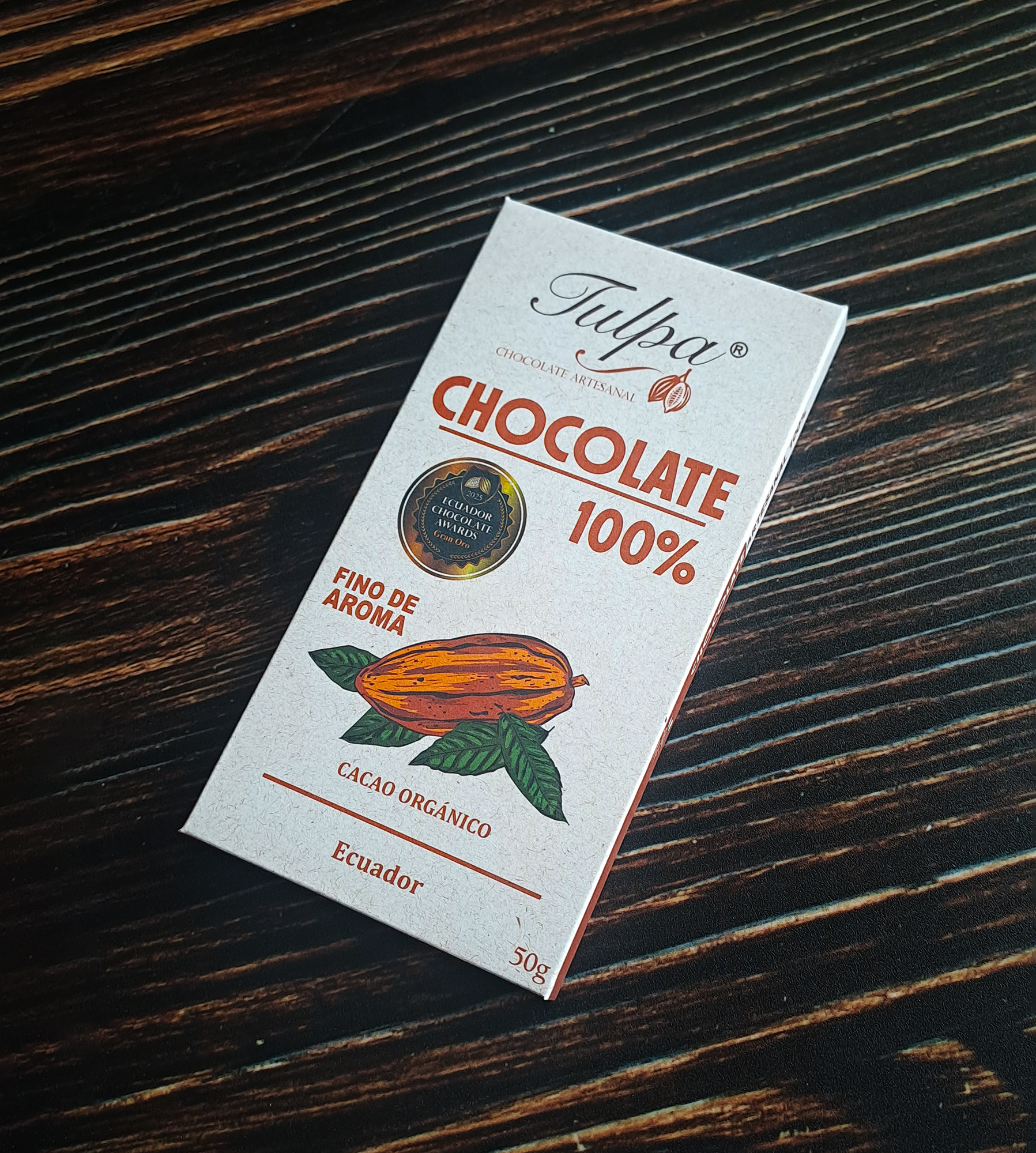 Barra de chocolate al 100% con cacao fino de aroma.